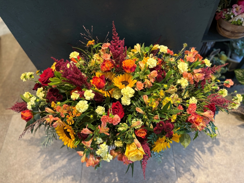 At The Flower Den we are delighted to present this luxury spray with autumnal shades of red, orange and yellow, available for flower delivery in Ennis and surrounding areas.