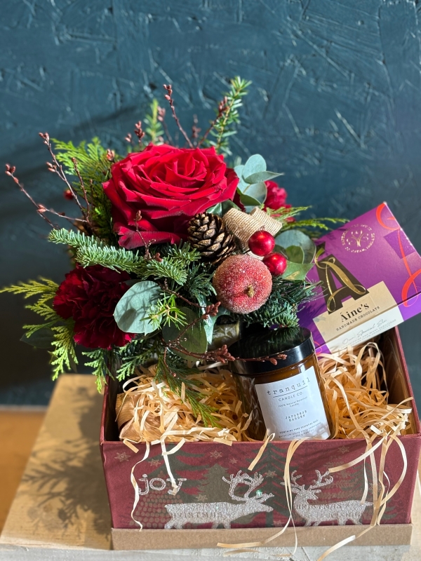 A beautifully designed festive arrangement of fresh flowers in a festive box.