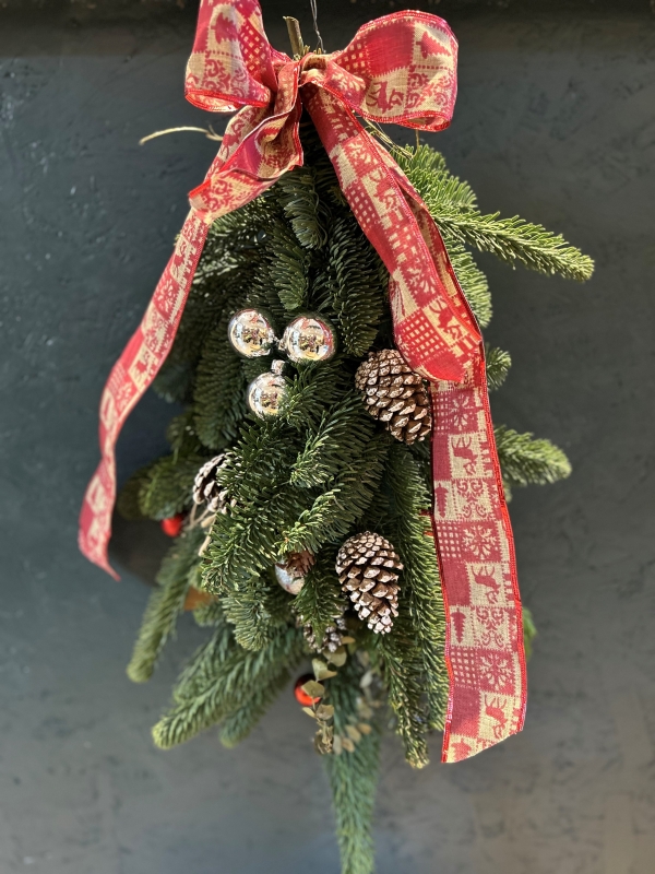 A festive door swag made with fresh Christmas greenery, pinecones & baubles, a lovely alternative to a traditional wreath